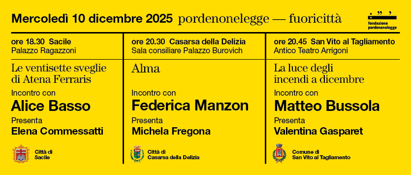 Giunge a conclusione mercoledì 10 dicembre pordenonelegge fuoricittà_autunno, che porta autrici e autori della scena letteraria nazionale a tu per tu con il pubblico, “prolungando” nel tempo autunnale la magia di pordenonelegge. Triplice appuntamento per il gran finale, a Sacile Casarsa della Delizia e a San Vito al Tagliamento, protagonisti gli scrittori Alice Basso, Federica Manzon e Matteo Bussola: due incontri promossi da Fondazione Pordenonelegge.it in sinergia con le Amministrazione comunali di Sacile, Casarsa della Delizia e di San Vito al Tagliamento. Ingresso gratuito, possibilità di prenotazione attraverso il proprio account mypnlegge sul sito www.pordenonelegge.it. Info: 0434.1573100 mail [email protected]. Il cartellone pordenonelegge fuoricittà_autunno è a cura di Gian Mario Villalta, Alberto Garlini e Valentina Gasparet.